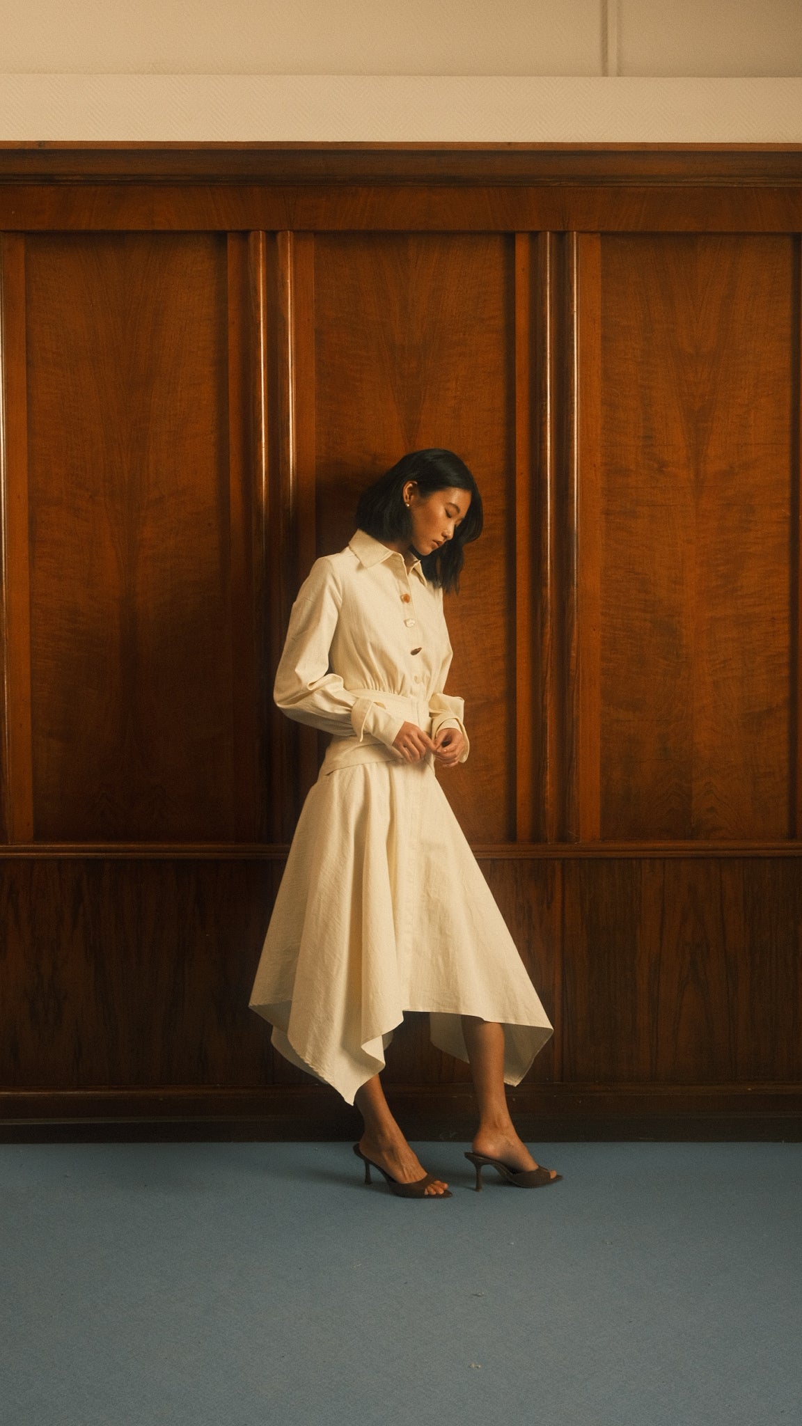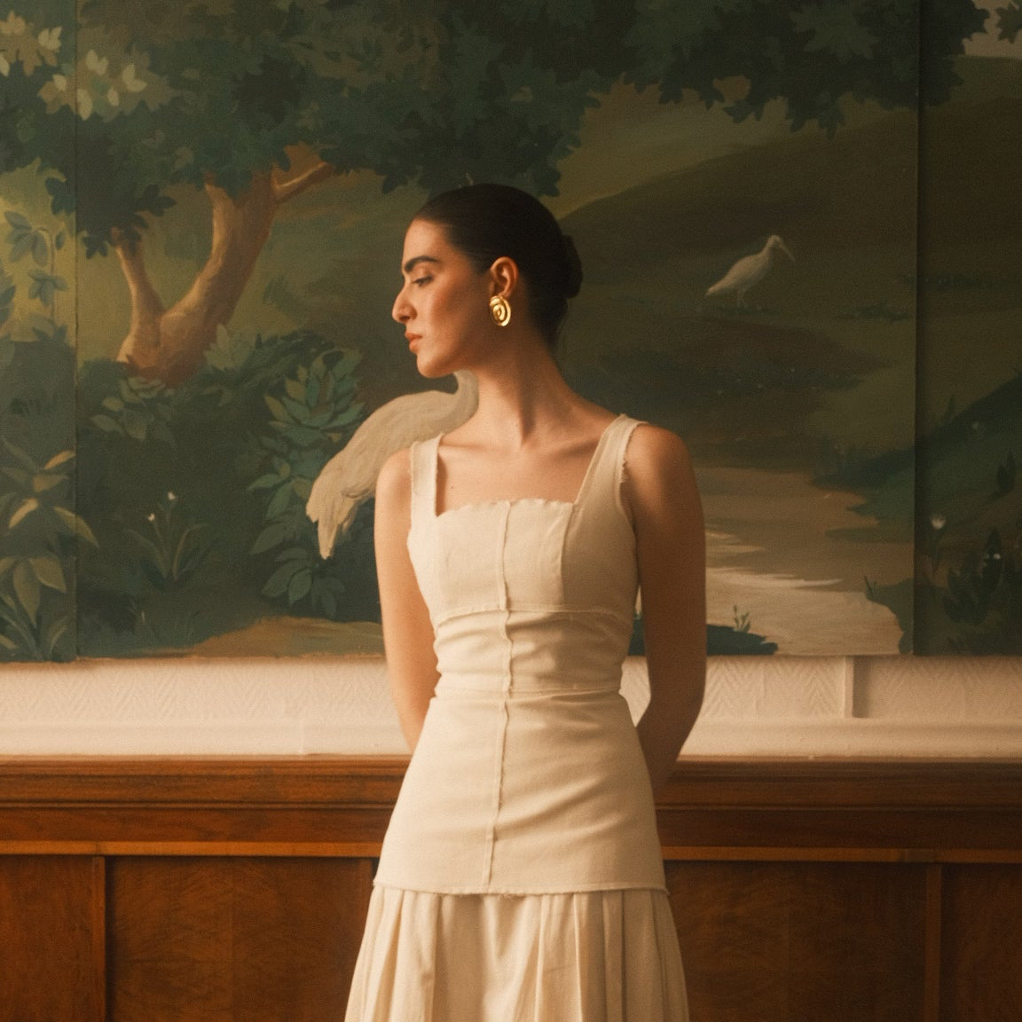 Pieces are built from lightweight materials like cotton voile, silk blends, and crisp linens, often combined in unexpected ways. Soft fabrics are pulled, ruched, and twisted to create volume and silhouette. Layering plays a key role — both as a styling element and a design approach — allowing garments to feel airy, yet composed.